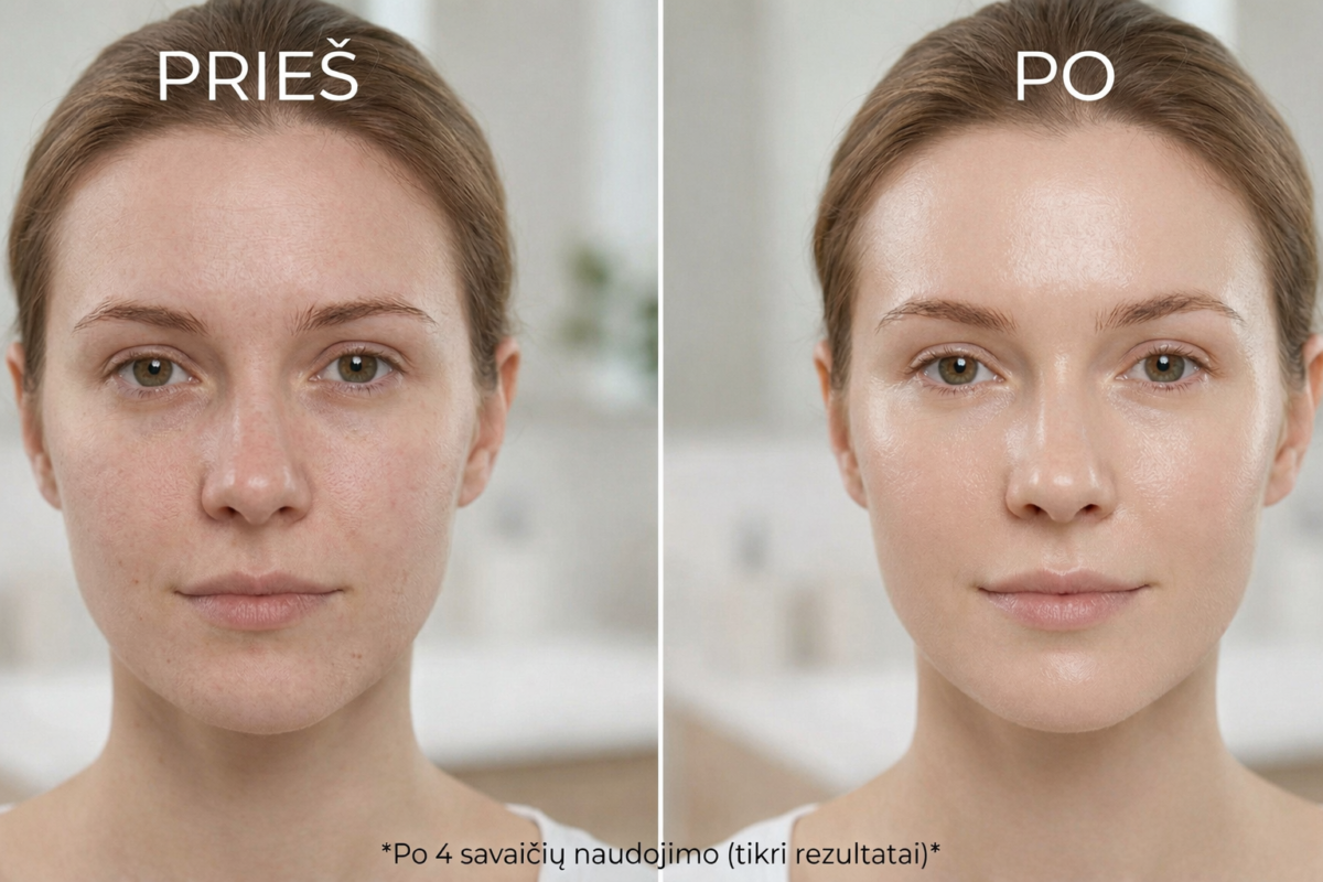 Nuotraukoje matomas realus odos pokytis po 4 savaičių reguliaraus serumo naudojimo. Ką pastebėsite jūs?
