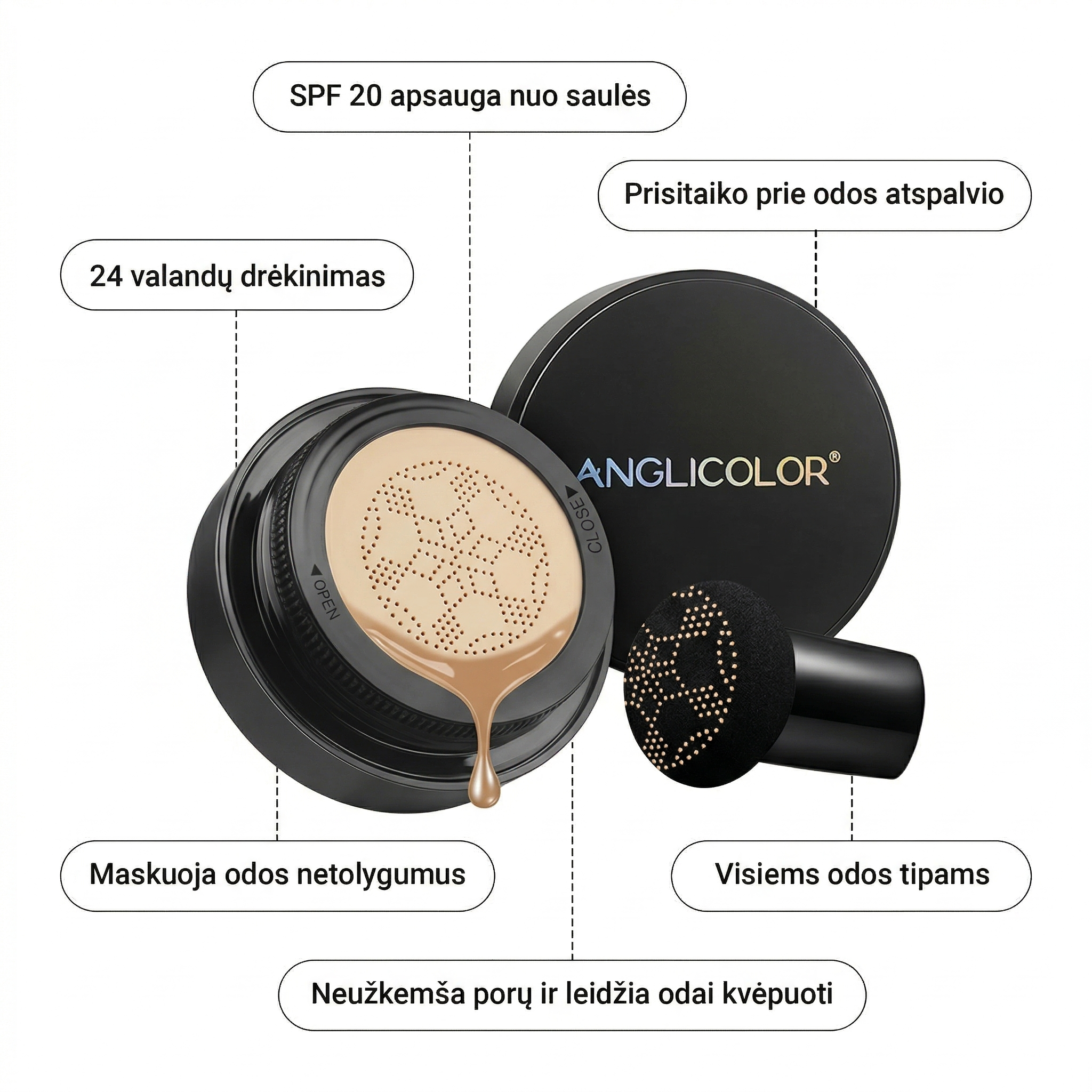 Šis itin lengvos konsistencijos kremas turi apsaugą nuo vandens bei prakaito, maskuoja veido