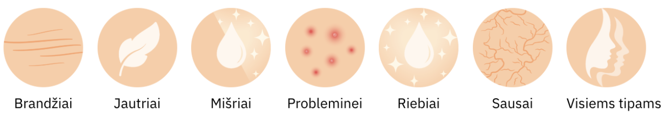 Šis produktas tinka visiems odos tipams: brandžiai, jautriai, mišriai, probleminei, riebiai, sausai odai.