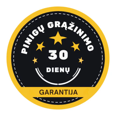 Mes užtikriname aukštą produkto kokybę, todėl suteikiame 30 dienų išbandymo laikotarpį. Produktui neatitikus Jūsų lūkesčių, garantuojame 100 proc. pinigų grąžinimą!