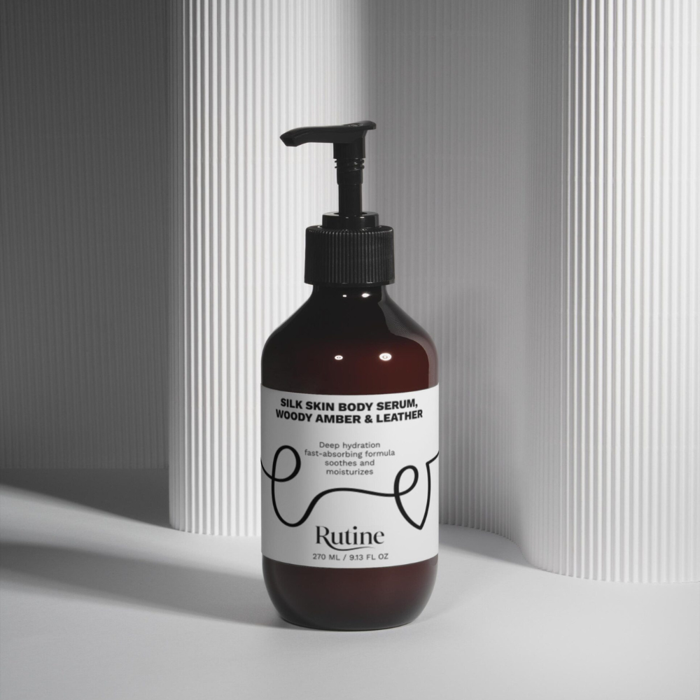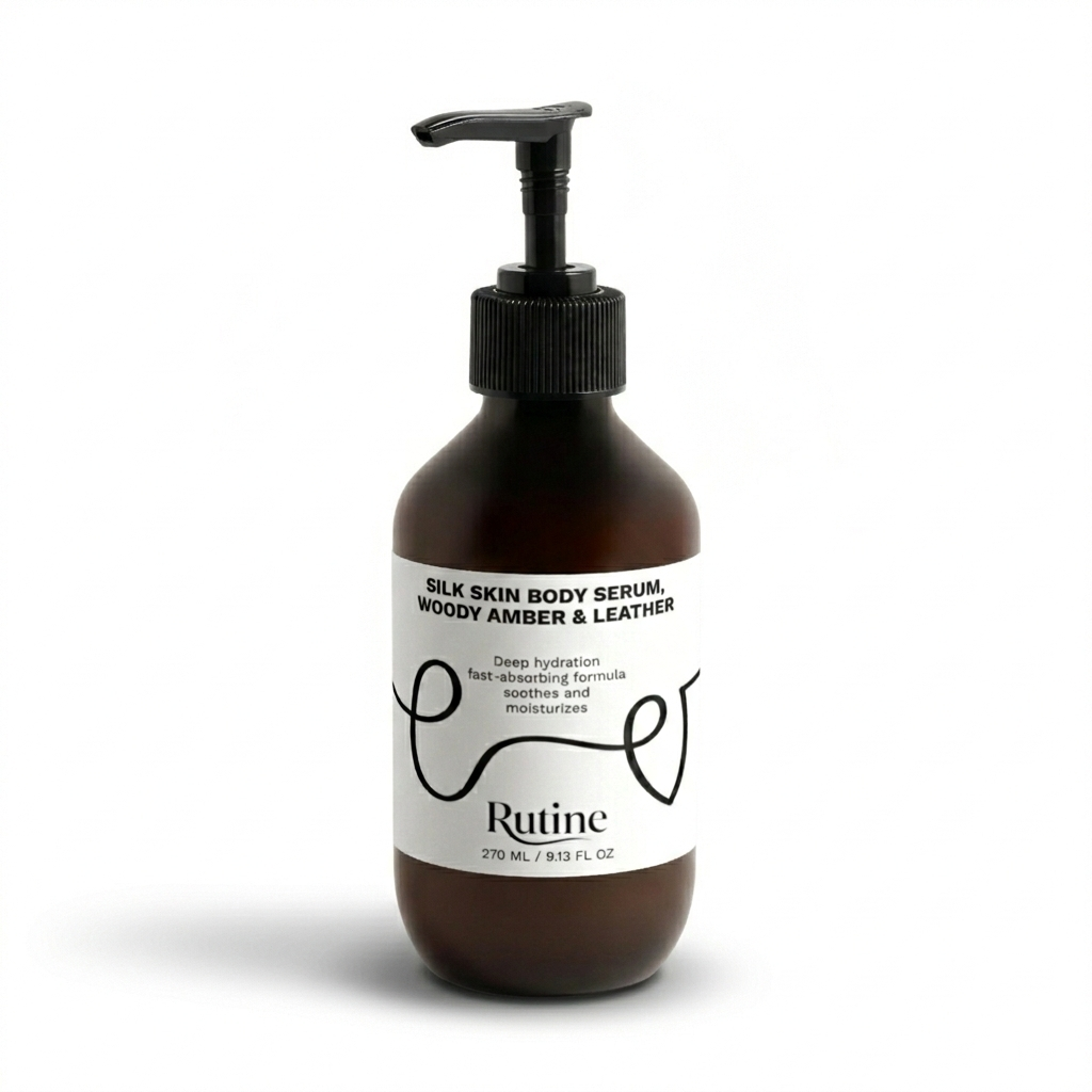Šilkinės odos kūno serumas, medienos, gintaro ir odos aromato